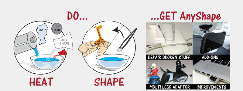 AnyShape er et formbart plast materiale som bliver blødt, når det opvarmes til 60 grader. Herefter kan du forme & farve AnyShape og kun din fantasi sætter grænsen - Som var det analog 3D print. AnyShape er perfekt til dine Hobby Projekter, Prototyper, Specialløsninger, Smykker, LifeHacks, eller Reparationer.